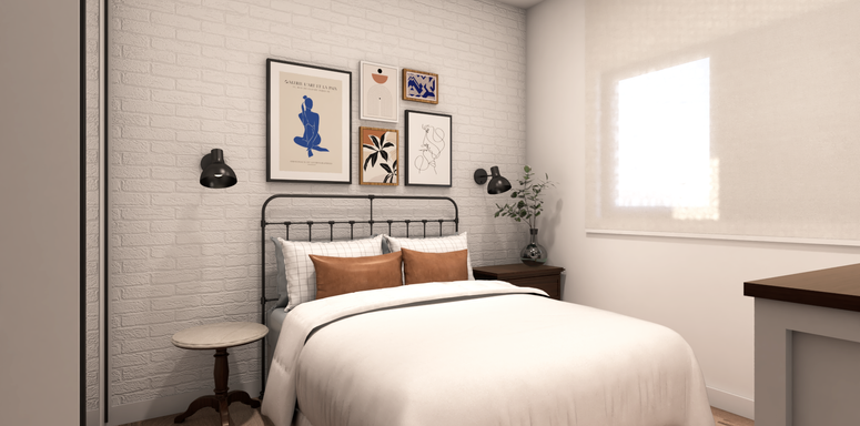 Para a sala, tivemos o conceito industrial nos direcionando, com cores fortes, conduítes aparentes, bricks e cimento queimado. Para o escritório e quarto, foi definida uma paleta de cores mais leve, que tornasse o ambiente neutro com alguns pontos de cor e textura.